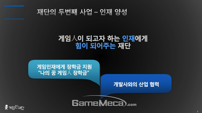 재단의 두 번째 사업인 '나의 꿈 게임人 장학금'은 남궁훈 이사장의 신념이 담긴 사업이기도 하다. 남궁 이사장는 "위메이드 있을 때 산학 협력을 고등학생 중심으로 했었는데, 대학생과 했을 때보나 비용대비성과가 훨씬 좋았다"며, 이러한 경험을 살려 게임 산업의 위상을 키움과 동시에 꿈나무들이 꿈을 키울 수 있는 구조로 장학금 제도를 구성할 계획이라고 전했다.
