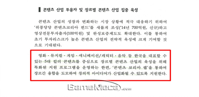 국가의 장·단기적 재정전략을 세우는 ’ 94쪽에는 “영화·뮤지컬·게임·애니메이션/캐릭터·음악 등 한국을 대표할 수 있는 5대 킬러 콘텐츠를 중심으로 장르별 콘텐츠 산업의 육성을 위해 특화된 지원 프로그램을 운영하는 한편, ‘콘텐츠 코리아 랩’을 통하여 장르 간 융합을 도모하여 창의적 아이디어가 산업화될 수 있도록 지원한다”고 밝히고 있기 때문.
