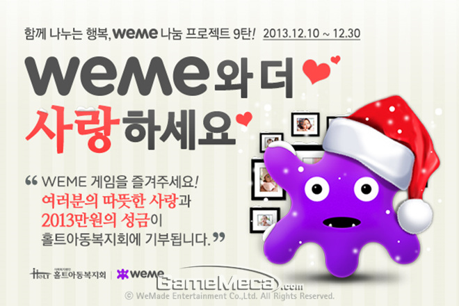 함께 나누는 행복'WEME와 더 사랑하세요'에 관련한 보다 자세한 내용은 이벤트 페이지(http://weme.wemade.com/event/20131210/event_main.asp)에서 확인할 수 있다.