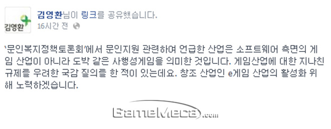 이에 SNS을 넘어 비난 여론이 형성되자 김영환 의원은 공식 SNS를 통해 입장을 밝혔다. 김 의원은 “복지정책토론회에서 문인지원 관련하여 언급한 산업은 소프트웨어 측면의 게임 산업이 아니라 도박 같은 사행성 게임을 의미한 것”이라며, 자신은 게임산업에 대한 지나친 규제를 우려한 국감 질의를 한 적도 있으며, 앞으로 창조 산업인 e게임 산업의 활성화 위해 노력하려고 한다는 뜻을 전했다.