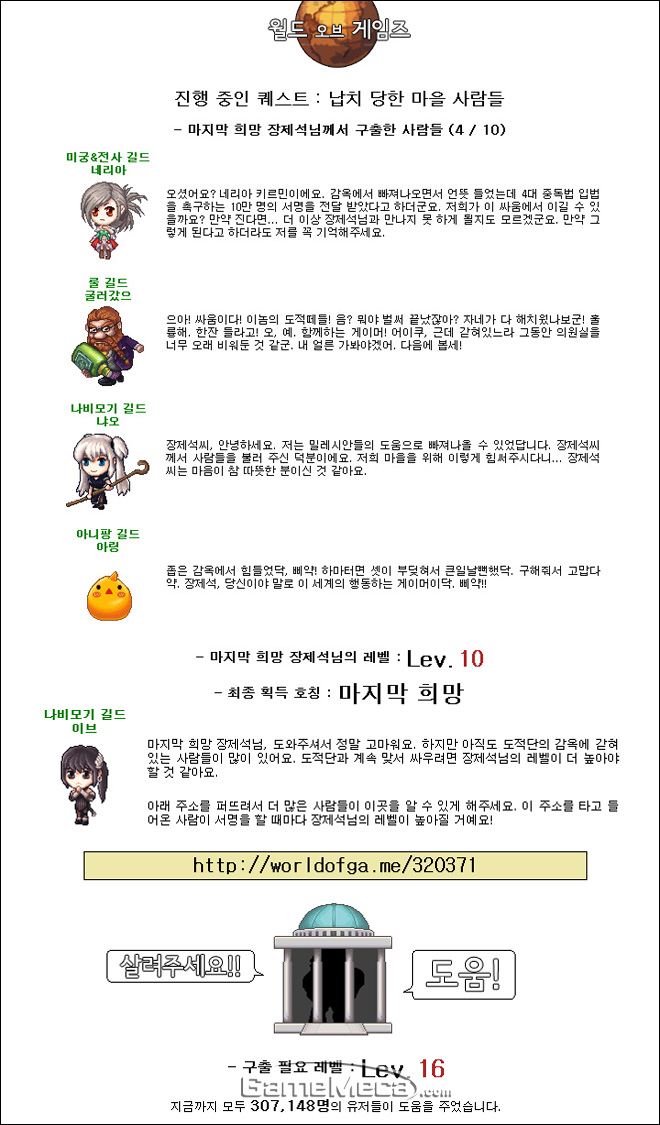 무엇보다 이 퀘스트의 가장 큰 재미는 서명 인원이 늘어날 때마다 감옥에 갇힌 마을 사람들을 구출하게 된다는 것인데, 제일 처음 구출되는 캐릭터는 아니팡 길드의 아링(애니팡), 다음은 나비모기길드의 냐오(마비노기 나오), 이어 전병헌 민주당 의원을 묘사한 듯한 롤길드 굴러갔으가 등장해 게이머에게 감사의 메시지를 전달한다.