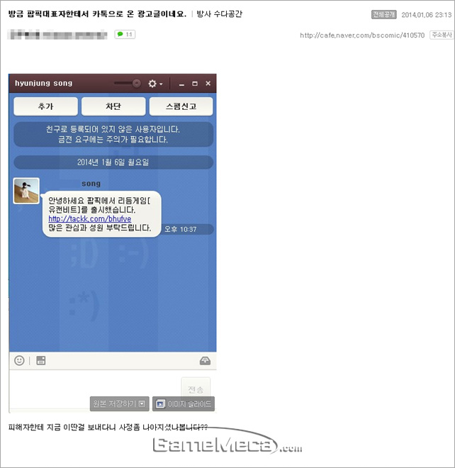 ▲ 팝픽 송현정 대표가 피해 학생의 가족에게 보낸 게임 홍보 메시지 (출처: 네이버 까페 '방사')