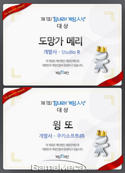 이 중 최종 후보작으로 선정된 '도망가 메리!'와 '윙또', '저승사자', '전설의 돌격대', 'JUMP GOOX'는 게임인재단 공식 홈페이지를 통해 인기투표가 진행된 바 있다. 이러한 과정을 통해 '도망가 메리'와 '윙또'가 '힘내라, 게임인상'의 1회 대상 수상작으로 결정됐다.