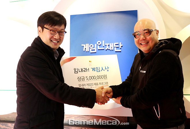 게임인재단은 22일, 경기도 판교에 자리한 게임인재단 사무실에서 제 1회 '힘내라 게임인상' 시상식을 개최했다. 스튜디오R이 개발한 '도망가 메리!'와 쿠키소프트의 '윙또'가 공동 수상의 영예를 안았다.