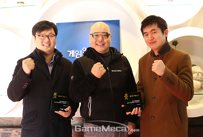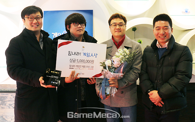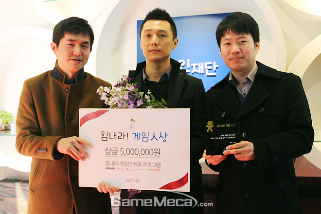 ㅁ▲ '힘내라 게임인상' 1회 시상식, 왼쪽부터 쿠키소프트 김강학 대표, 게임인재단 남궁훈 이사장, 스튜디오R 이지용 기획
