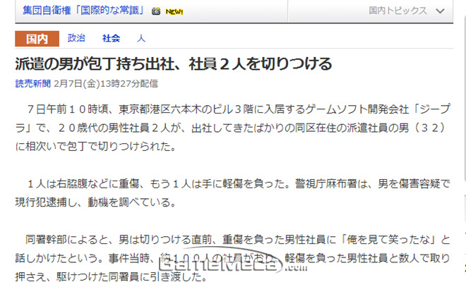 일본 요미우리신문은 7일 오전 10시 경 도쿄 롯폰기에 위치한 유명 모바일게임 개발회사 G 사에서 파견 사원이 동료 2명을 칼로 찔러 중상을 입힌 혐의로 체포됐다고 보도했다.