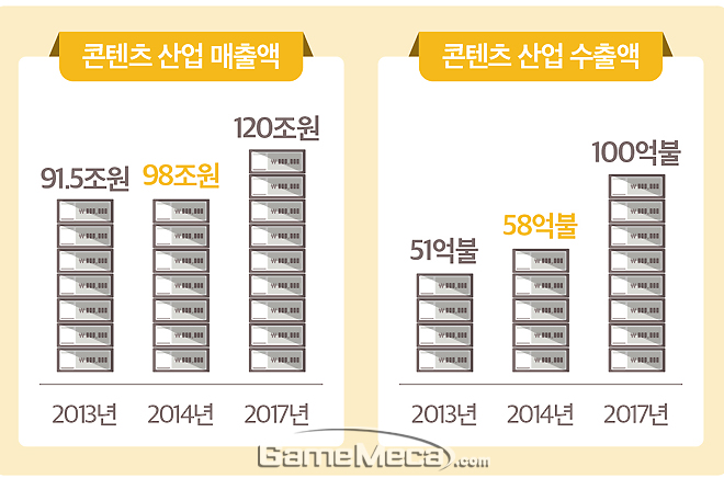 문화부는 2월 13일 박근혜 대통령에게 2014년도 업무계획을 보고했다. 문화부는 올해 콘텐츠산업의 매출액과 수출액 목표를 각각 98조원, 58억불로 잡았다. 국내 콘텐츠산업은 2013년 매출액 90조원, 수출액 51억불을 기록한 바 있다. 특히 게임산업은 2013년에 매출 10조, 수출 29억 달러를 기록했으며, 수출은 전체 콘텐츠산업의 58%에 달하는 성과를 달성했다.