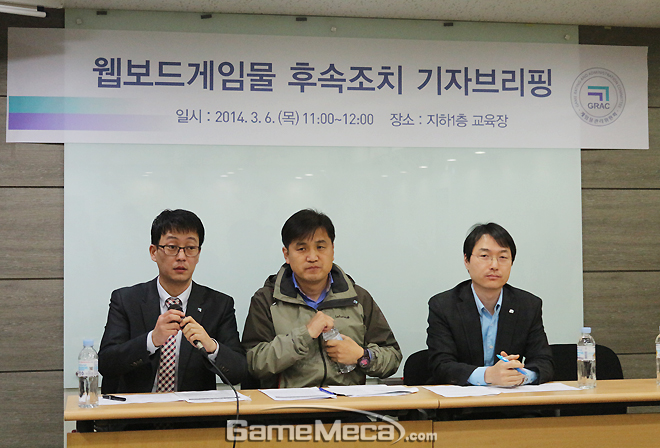 게임물관리위원회는 6일, 게임물관리위원회 서울사무소에서 웹보드게임 후속조치에 대한 중간 브리핑을 열었다. 웹보드게임 규제는 ▲ 한 달 게임머니 구입한도 30만원 ▲ 한 판에 최대 3만원 ▲ 하루 10만원 이상의 게임머니를 잃은 이용자의 접속을 24시간 동안 차단하는 것을 주 내용으로 하고 있다. 이를 위반하면 1차는 경고, 2차부터 영업정지 처분을 받는다 영업정지는 1회 5일, 2회 10일, 3회 30일로 나누어 적용되며, 회사 전체가 아닌 법을 위반한 게임에 한해서 적용된다.