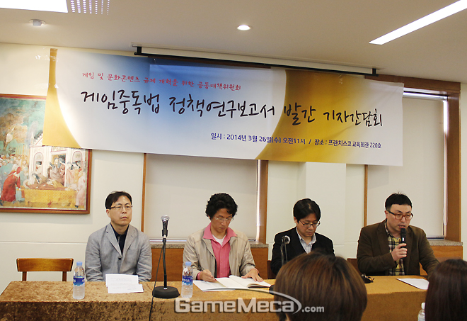 공대위는 26일, 프란치스코 교육회관에서 기자간담회를 열고 ‘게임중독법 정책연구보고서’를 발표했다. 한국예술종합학교 이동연 교수는 “지난 3년 전, 셧다운제가 일방적으로 통과될 때도 게임업계는 그 논리를 반박하지 못했다. 논리적 차원의 연구 보고서가 없었기 때문에 대응이 미진한 것이 그 원인이라 판단한다. 따라서 그런 과오를 반복하지 말아야겠다는 생각으로, 게임중독법은 대응 초기부터 탄탄한 연구보고서를 만들어보자고 결정했다”라고 말했다.