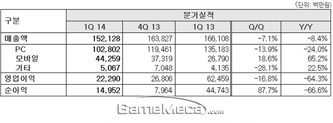 ▲ NHN엔터테인먼트의 2014년 1분기 실적표 (도표제공: NHN엔터테인먼트)