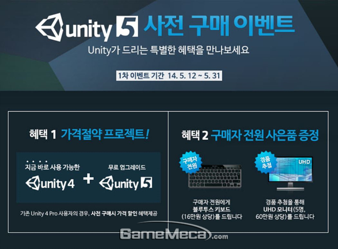 유니티 코리아는 '유니티 5 Pro' 사전 구매 이벤트를 오는 31일까지 진행한다고 밝혔다.