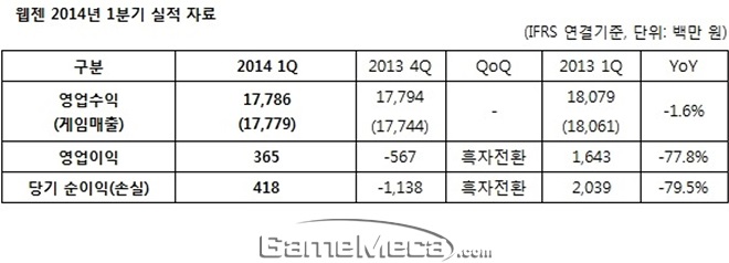 웹젠은 14일, 자사의 2014년 1분기 실적을 공시했다.