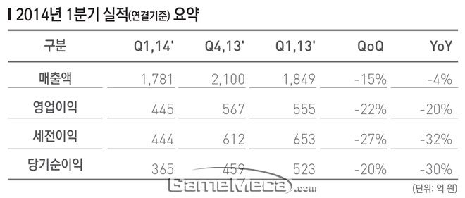 ▲ 엔씨소프트 2014년 1분기 실적 도표 (자료제공: 엔씨소프트)