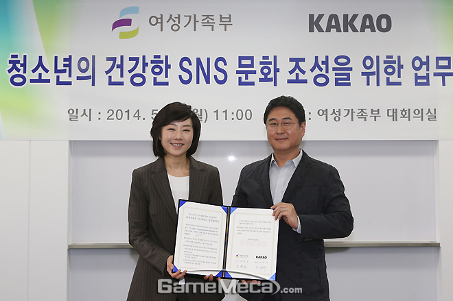 카카오와 여성가족부(이하 여가부)는 19일(월) 11시, 여성가족부 대회의실에서 ‘청소년들의 건강한 소셜네트워크서비스(이하 SNS) 문화 조성을 위한 업무협약’을 체결했다고 발표했다.