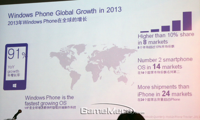 그는 "현재 윈도우폰이 iOS나 안드로이드 기반 기기에 비해 보급율은 낮지만 런칭 후 91%의 성장세를 보였다"며 "특히 러시아와 인도 등 인구가 많은 시장에서는 가장 점유율이 높으니 중국 시장에서도 큰 영향을 발휘할 것"이라고 말했다.