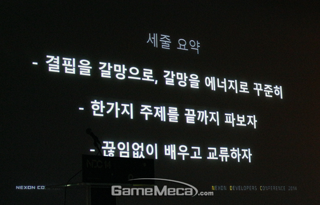 김학규 대표가 NDC 14를 통해 후배 개발자들에게 조언을 전했다. 그가 전한 메시지는 '최소 5년은 한 가지에 매진할 것' 그리고 '본인 스스로를 항상 점검하고, 다음 목표를 정할 것'이다.
