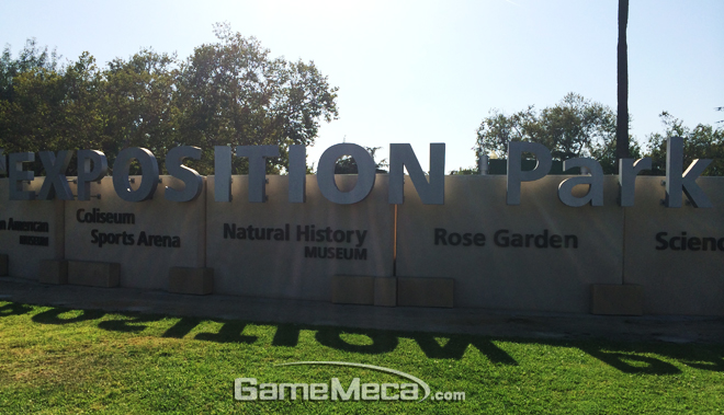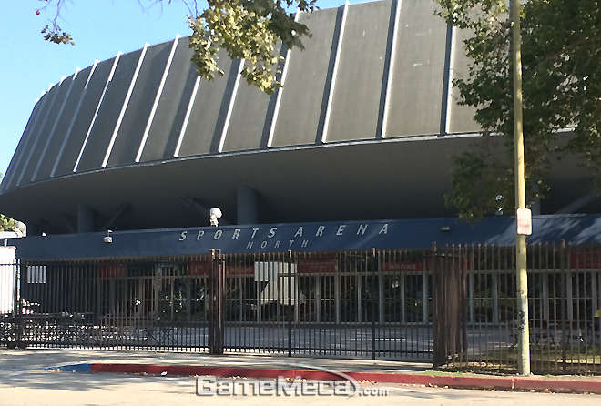 ▲ SCE의 프레스 컨퍼런스가 열리는 메모리얼 스포츠 아레나가 자리한 엑스포지션 파크 입구