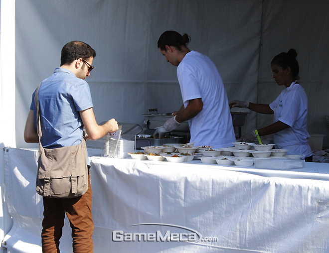 ▲ 입장한 사람들에게 음식을 무료로 나눠주고 있었다