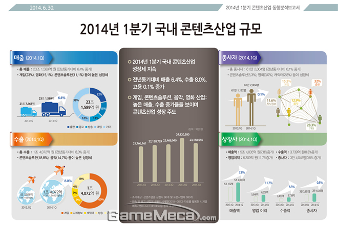 2014년 1분기 우리나라 콘텐츠 산업 전체 매출액은 지난해 동기대비 1.4조 원 증가한 23.2조 원으로 조사되었고, 수출액은 1,000억 원 증가한 1.4조 원으로 조사되어 전년 같은 기간에 비해 각각 6.4%, 8.0%씩 증가했다.
