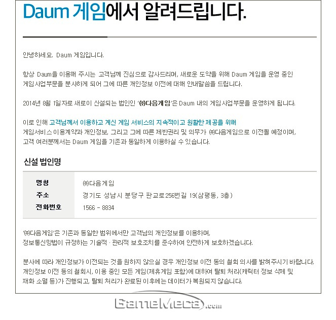 이와 함께 게임서비스 이용계약과 개인정보, 그에 따른 제반권리 및 의무가 다음게임으로 이전되며, 이를 원치 않는 유저에 한해 개인정보 이전 동의 철회 서비스가 제공된다.
