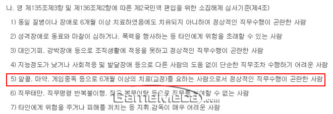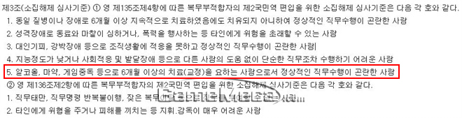 논란이 된 부분은 '사회복무요원 복무부적합자 소집해제 처리규정' 제 3조 5항이다. 이 항목에 따르면 알코올과 마약, 게임중독 등으로 6개월 이상 치료를 요하는 사람이라면 사회복무요원 소집해제 사유에 해당된다.