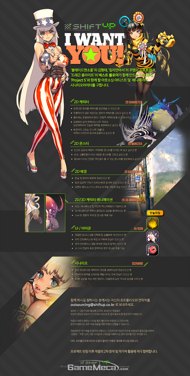 모집 분야는 아웃소싱 아티스트(2D 몬스터, 2D 캐릭터, 2D 배경), 애니메이터(2D/3D), UI/아이콘 디자이너, 시나리오 라이터 등이며, '드래곤 플라이트' 개발사인 넥스트플로어와 함께 제작하는 신작 모바일 RPG '프로젝트 S' 개발에 투입된다.