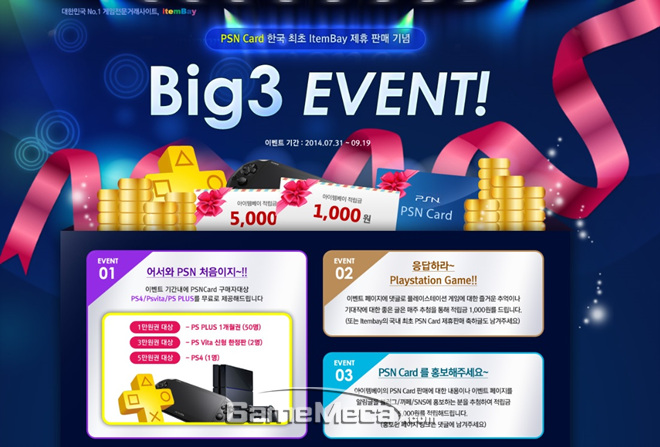 아이템베이는 PSN 카드 제휴를 기념해 7월 31일부터 9월 19일까지 약 3달간에 걸쳐 ‘아이템베이에서 PSN 카드 국내 최초 제휴기념 Big 3이벤트’를 진행한다. 먼저 PSN 카드 구매자 중 구매 금액별로 추첨한 총 53명에게 경품이 증정된다. 1만 원권 구매자들은 PS 플러스 1개월 권(50명), 3만 원권 구입자는 PS 비타 신형 한정판(2명), 5만 원권 구입자는 PS4(1명)를 제공하는 이벤트에 참여할 수 있다.