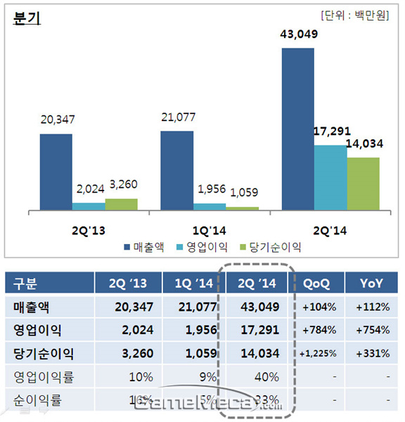 컴투스는 6일(수) 실적발표를 통해 2014년 2분기 매출 430억 원, 영업이익 173억 원을 기록해 최대 실적을 달성했다고 밝혔다. 매출은 전년 동기 203억 대비 112% 상승했고, 영업이익은 2013년 2분기 20억보다 754% 오른 수치다.