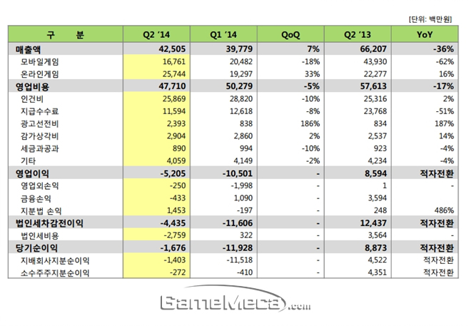 위메이드 엔터테인먼트는 2014년 2분기 실적으로 매출 425억 원, 영업손실 52억 원, 당기순이익 16억 원을 달성했다.