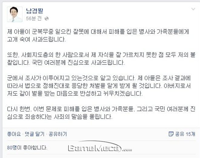 이와 관련해 남경필 지사는 자신의 페이스북에 기재한 사과문을 통해 “제 아들이 군복무 중 일으킨 잘못에 대해서 피해를 입은 병사와 가족분들에게 고개 숙여 사과드립니다”라며 “사회지도층의 한 사람으로서 제 자식을 잘 가르치지 못한 점 모두 저의 불찰입니다. 국민 여러분께 진심으로 사과드립니다”라고 밝혔다.