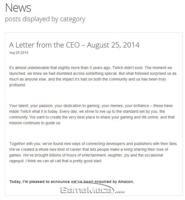 ▲ 아마존의 트위치 인수 발표 공지(사진출처: 트위치 공식 블로그)