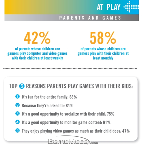 이 중 부모와 게임(Parents and Games) 분야에는, 미국 학부모들이 자녀의 게임 플레이를 어떻게 바라보는지에 대한 조사 결과가 수록되어 있다. 먼저, 미국 학부모의 56%는 비디오게임이 자녀의 삶에 긍정적인 영향을 미친다고 말했다. 구체적인 항목으로는 자녀의 정신적 발달에 좋은 영향을 준다는 답변이 68%, 친구와의 커뮤니케이션을 도와준다는 답변이 58%, 가족과 함께 하는 시간을 갖게 해준다는 의견이 55%를 차지했다. (중복 답변 가능)