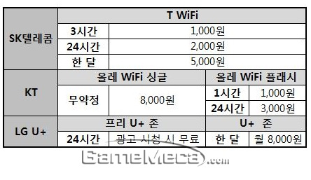 ▲ 통신사별 WiFi 존 요금. 다른 통신사를 이용중인 사람에게만 해당된다