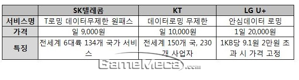 각 이동통신사별로 알아보면 SK텔레콤은 스마트폰 데이터 서비스로 사용할 수 있는 T로밍 데이터무제한 원페스를 제공하고 있다. 이 요금제는 전 세계 6대륙 134개 국가에서 제공되는 서비스로 가격은 24시간에 9,000원이다.