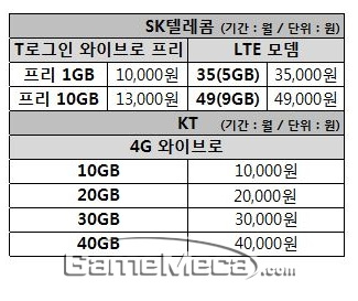 먼저 SK텔레콤은 LTE 모뎀과 와이브로 에그 두 가지로 나눠 서비스를 제공한다. LTE 모뎀의 요금은 사용할 수 있는 용량에 따라 한 달 요금이 5GB에 35,000원, 9GB에 49,000원으로 나뉜다. 와이브로 에그로 사용할 수 있는 요금제는 T로그인 와이브로 프리다. 1GB와 10GB의 두 가지로만 가입할 수 있으며, 한 달 요금은 각각 10,000원과 13,000원이다.