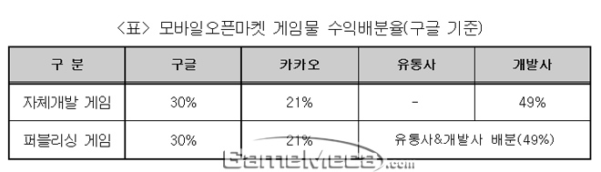 한국의 주요 게임 플랫폼으로 자리한 모바일게임의 뜨거운 감자 중 하나는 수익배분이다. 국회 교문위 소속 한선교 위원은 이와 같은 문제를 지적하며 최근 공정거래위원회가 이에 대한 조사에 착수했다고 밝혔다.