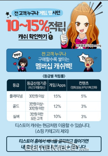 SK플래닛이 오는 10월 31일까지 진행하는 ‘T store 멤버십 캐쉬백’은 티스토어 에서 게임이나 앱, 음악, 영화, 방송, 만화 등을 구매하면 전체 금액의 5~15%에 해당하는 티스토어 캐쉬를 적립해준다. 특히 티스토어를 통해 다운로드 받은 스마트폰 게임 및 애플리케이션은 최대 15%까지 적립이 가능하며, 적립된 캐쉬로는 만화, 영화 등의 문화 콘텐츠를 이용할 수 있다.