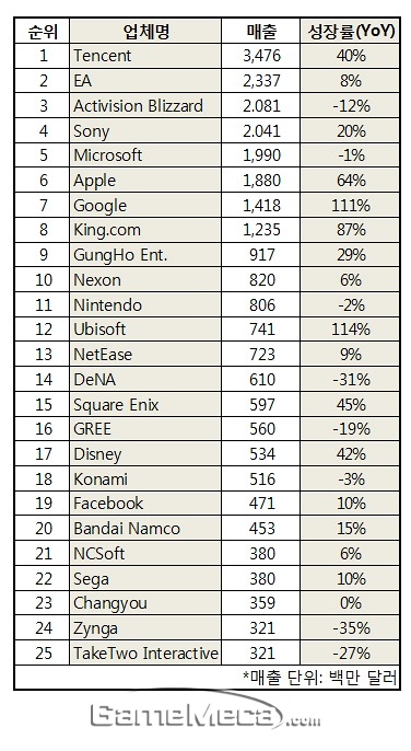 게임 시장 조사기업 Newzoo.com은 지난 30일(현지시간), 2014년 상반기 매출을 기반으로 한 전세계 게임업체 Top 25를 발표했다.