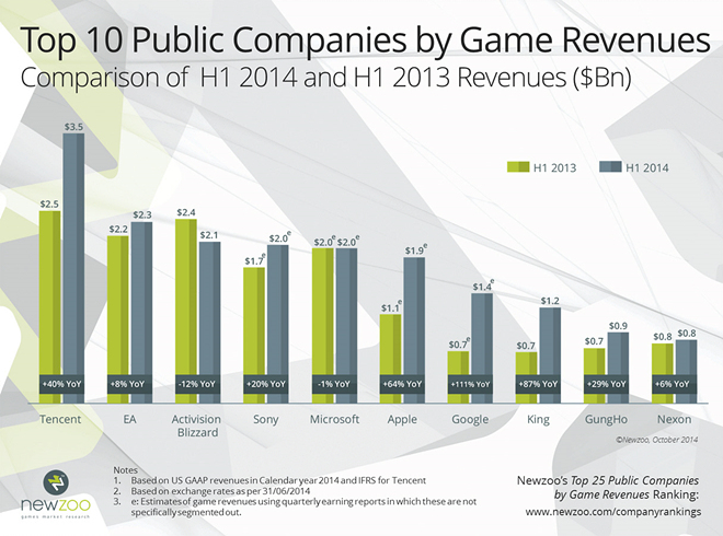 전세계 모바일게임 플랫폼을 양분하고 있는 애플과 구글의 약진도 계속되고 있다. 애플과 구글은 2013년 게임매출 순위에서 각각 8위와 13위를 기록했으나, 2014년 상반기 순위에서는 애플 6위(19억 달러, 2조 원), 구글 7위(14억 달러, 1조 5천억 원)를 기록했다. 이는 나날이 커져 가는 스마트폰 모바일게임 시장의 추이를 반영한 결과다.