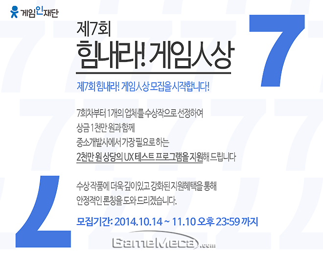게임인재단은 14일부터 '제 7회 힘내라! 게임인상' 접수를 시작한다. 접수 마감 기한은 11월 10일(월)이다.