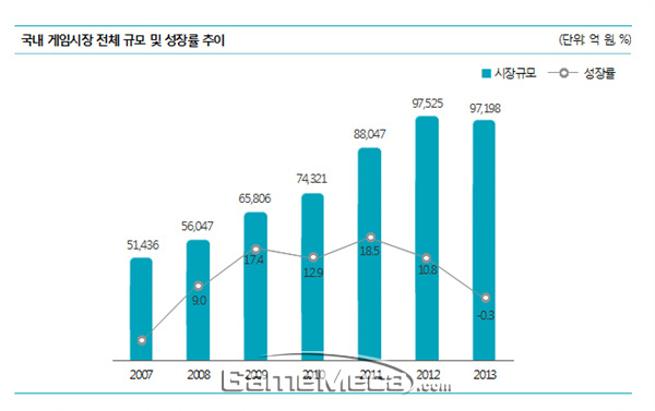 한국콘텐츠진흥원이 30일(목) 발간한 ‘2014 대한민국 게임백서’에 따르면 2013년 국내 게임시장 총 규모는 9조 7,198억 원으로, 2012년 국내 게임시장 규모인 9조 7,525억 원 대비 0.3% 감소했다. 2007년 이후 꾸준히 13%대 성장세를 이어오던 국내 게임업계의 기세가 6년 만에 꺾인 것이다.