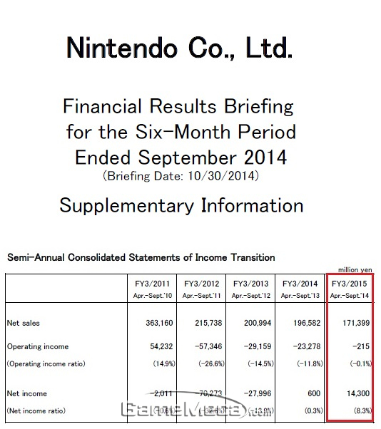 닌텐도는 29일, 자사의 2014년 3분기(일본 회계연도 기준 2015년 2분기, 2014년 7월 1일~9월 30일) 실적을 발표했다.
