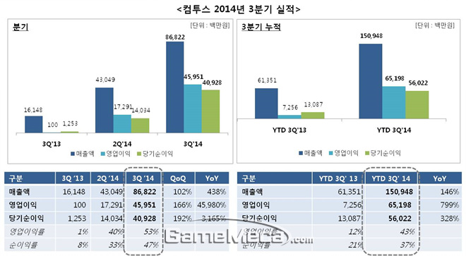 컴투스는 5일(수) 실적발표를 통해 2014년 3분기에 매출 868억 원과 영업이익 460억 원, 당기순이익 409억 원으로 역대 최대 분기 실적을 기록했다고 전했다.