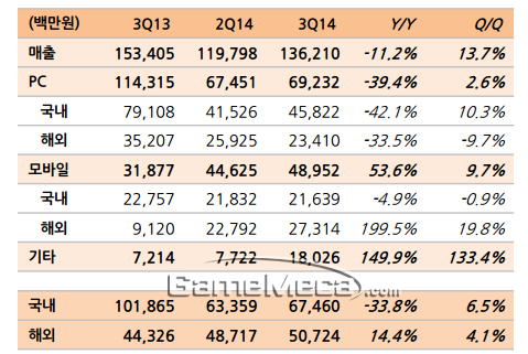 ▲ NHN엔터테인먼트 2014년 3분기 매출 표 (사진제공: NHN엔터테인먼트)