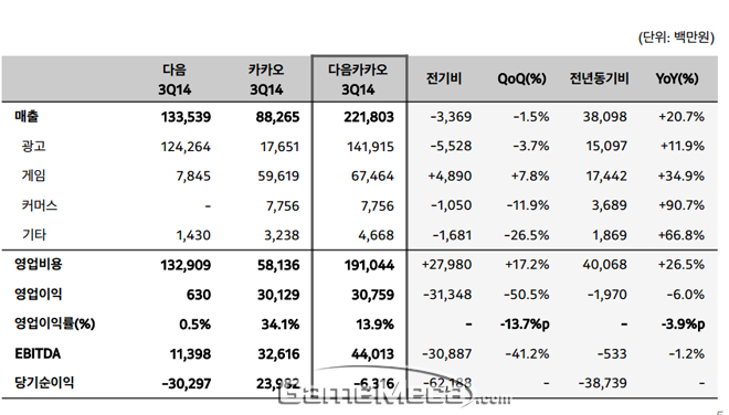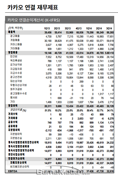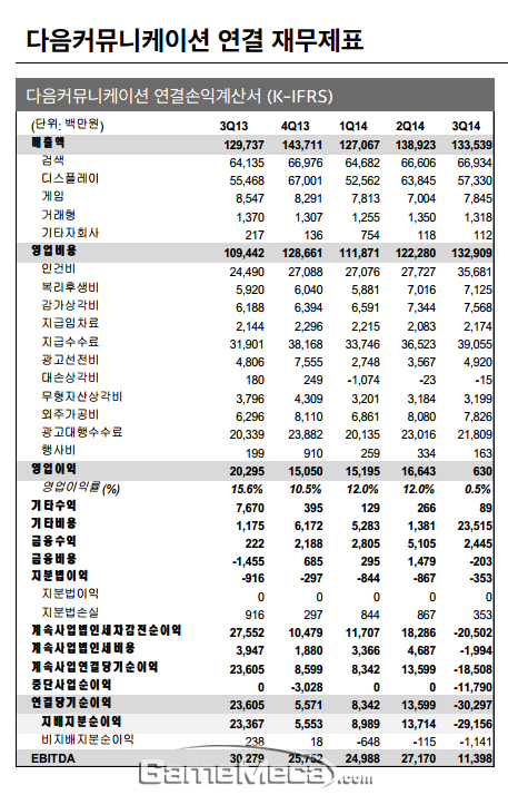 ▲ 다음카카오 2014년 3분기 실적 (자료제공: 다음카카오)