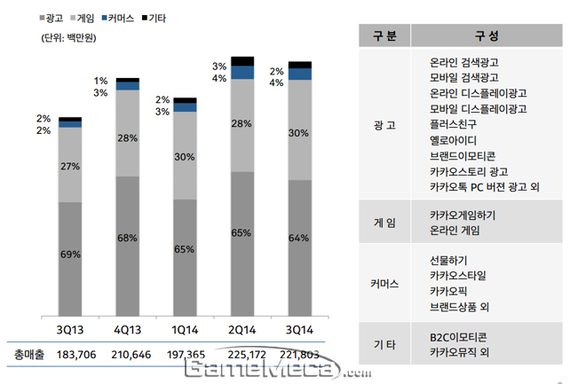 다음카카오가 합병 후, 첫 실적을 발표했다. 2014년 3분기 기준 다음카카오는 매출 2,218억 원을 달성했다. 이 중 게임이 차지하는 비중은 전체의 약 30%다.