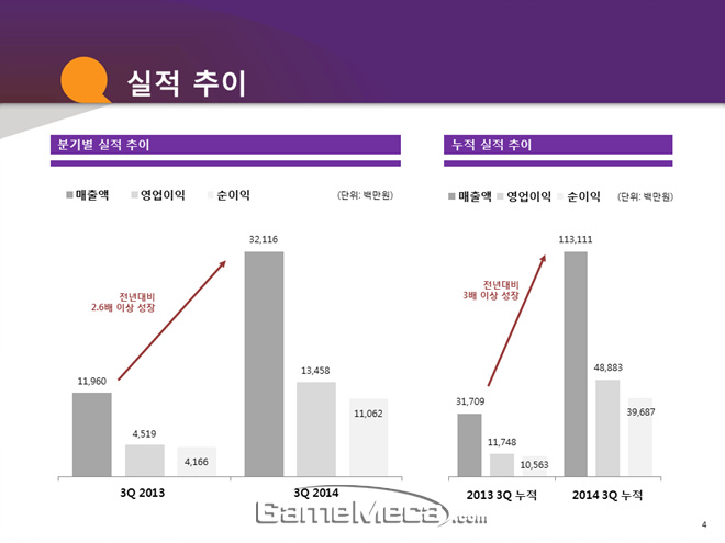 총 매출은 전년 동기 대비 169% 상승했고, 영업이익 또한 전년 동기 대비 198% 오른 수치로 9분기 연속 흑자를 기록했다. 또한 당기순이익 111억원을 달성해 전년 동기 대비 2배 이상의 성장을 이어갔다. 특히 2014년 3분기까지의 누적 매출은 1,131억 원에 달한다.