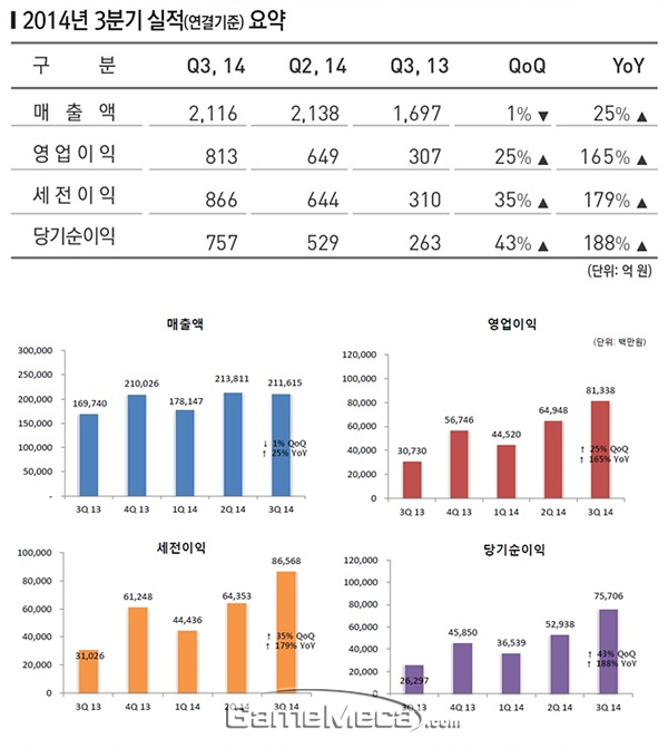 엔씨소프트는 2014년 3분기 실적(연결기준)을 발표했다.
