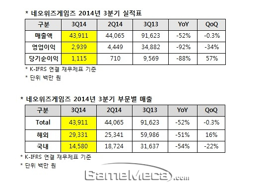 네오위즈게임즈는 2014년 3분기 결산 결과, 매출 439억 원, 영업이익 29억 원, 당기순이익 11억 원을 기록했다. 2014년 3분기 매출액과 영업이익은 전 분기 대비 0.3%, 32% 하락했고, 당기순이익은 57% 상승한 수치다.