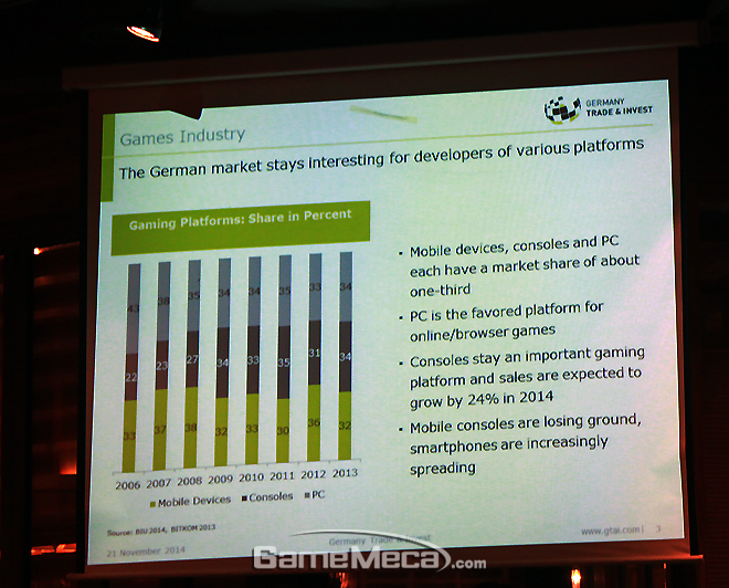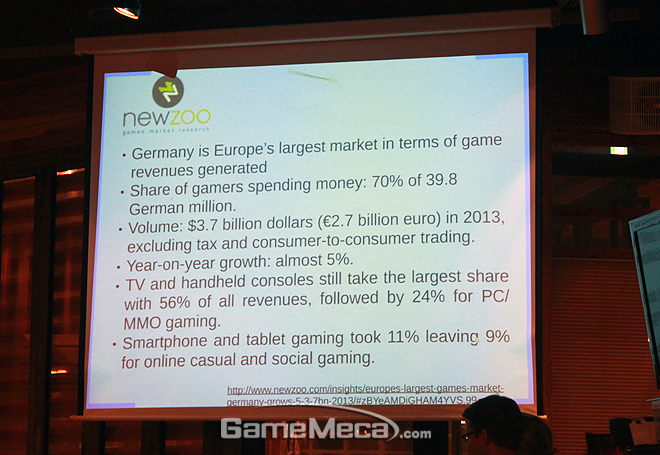 21일, 지스타 2014가 열리고 있는 벡스코 제1전시장 지하 1층 파티앤플레이에서 베를린 브란덴부르크 연방주가 한국 게임업체를 상대로 한 유치 설명회를 개최했다. 본격적인 이야기에 앞서 독일 시장에 대한 개요를 들어볼 수 있었다. 시장조사 전문업체 뉴주의 발표에 따르면 독일에는 2013년 기준 4,000만 명의 게이머가 자리하고 있으며 시장 규모는 37억 달러, 한화로 약 4조 원 정도다.